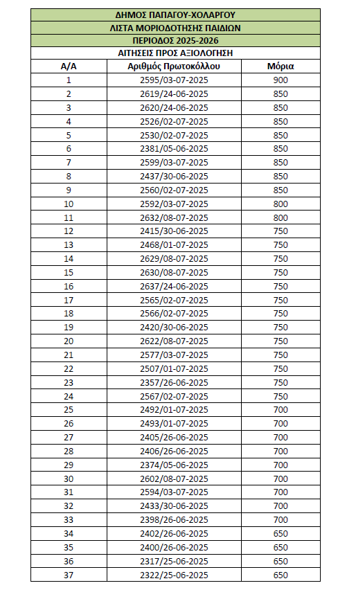 Τους πίνακες με τη συνολική μοριοδότηση των αιτήσεων εγγραφής βρεφών και προνηπίων για το σχολικό έτος 2025-2026 ανακοίνωσε η Διεύθυνση Προσχολικής Αγωγής, Παιδείας & Διά Βίου Μάθησης του Δήμου Παπάγου – Χολαργού.