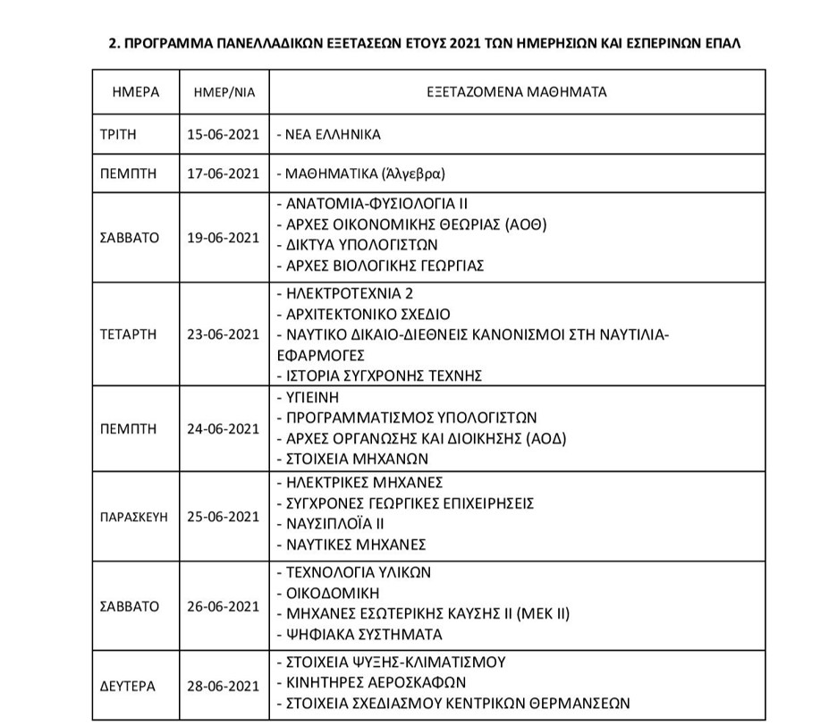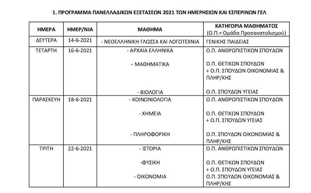 Πανελλαδικές εξετάσεις 2021: Το Υπουργείο Παιδείας και Θρησκευμάτων ανακοινώνει Tο πρόγραμμα των πανελλαδικών εξετάσεων Γενικών Λυκείων και Επαγγελματικών Λυκείων 2021, όπως αυτό καθορίστηκε με σχετικές Υπουργικές Αποφάσεις
