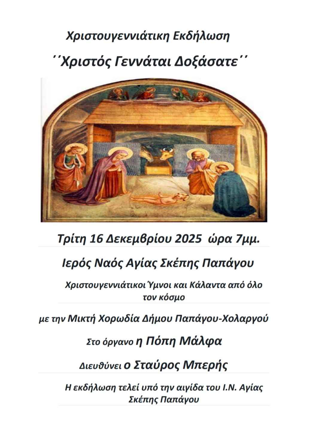 Σε κλίμα κατάνυξης και πνευματικής προετοιμασίας για τα Χριστούγεννα, ο Ιερός Ναός Αγίας Σκέπης Παπάγου διοργανώνει χριστουγεννιάτικη εκδήλωση με τίτλο «Χριστός Γεννάται, Δοξάσατε», αύριο Τρίτη 16 Δεκεμβρίου 2025 και ώρα 7:00 μ.μ.