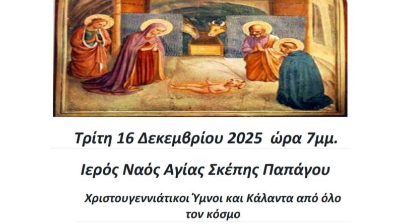 Σε κλίμα κατάνυξης και πνευματικής προετοιμασίας για τα Χριστούγεννα, ο Ιερός Ναός Αγίας Σκέπης Παπάγου διοργανώνει χριστουγεννιάτικη εκδήλωση με τίτλο