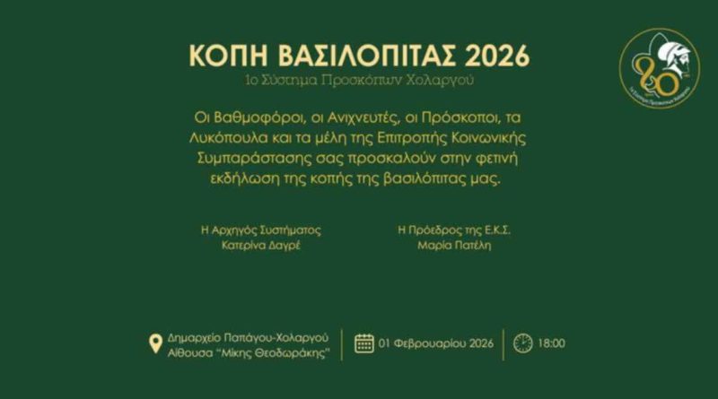 Read moreΤην καθιερωμένη κοπή της πρωτοχρονιάτικης βασιλόπιτάς του διοργανώνει το 1ο Σύστημα Προσκόπων Χολαργού, την Κυριακή 1 Φεβρουαρίου 2026, στις 18:00,